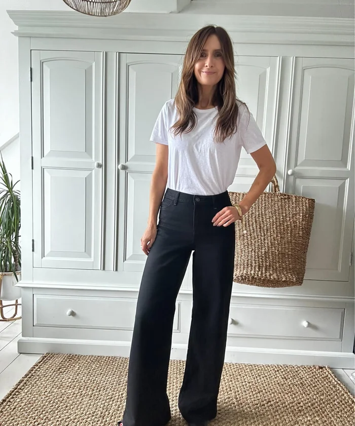 Für einen Tageslook würde ich die denim-blaue Variante mit einem weißen T-Shirt oder Sweatshirt, einem braunen Gürtel, einem Trenchcoat und Sneakern oder Loafern kombinieren. Für einen festlicheren Anlass würde ich die schwarze Variante mit einem kleinen Absatz tragen. Ich würde ein festlicheres Top und einen Blazer und richtig tollen Schmuck hinzufügen.
