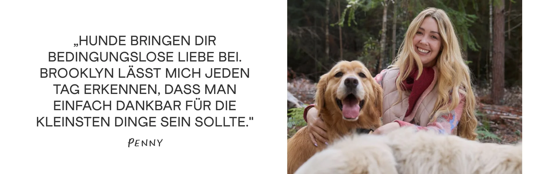 Penny: Brooklyn wurde tatsächlich aus dem Fleischhandel in China gerettet. Wir glauben, er war etwa sechs Monate alt und saß auf der Ladefläche eines Fleischtransporters mit 60 anderen Hunden. Diese unglaubliche Organisation hat ihn gerettet und aufgenommen. Er hatte ein richtig schweres Virus, das für Hunde oft tödlich ist, und er hat's überlebt.