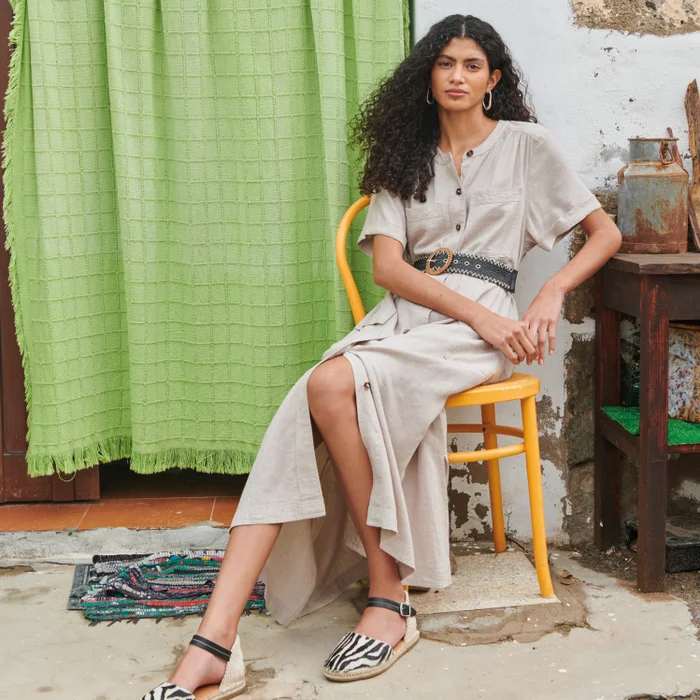 Weich und fließend, in neutralen Farben. Das ist entspannter Luxus. Dieser Style ist für einen Sommer im Büro oder ganz weit weg vom Büro schön. Und zu deinem Leinenkleid musst du eigentlich nur noch die richtigen Accessoires auswählen. Dieses hier zum Beispiel passt gut zu Espadrilles und einem starken Gürtel.
